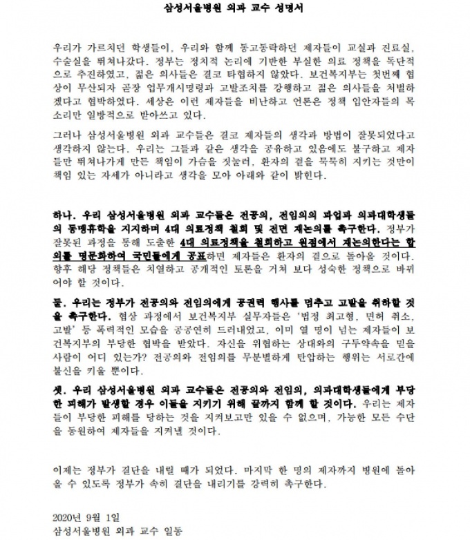 [µ¥Àϸ®¸Þµð ¹ÚÁ¤¿¬ ±âÀÚ] ¼¿ï¼º¸ðº´¿ø ¿Ü°ú ±³¼öµéÀÌ ¿À´Â 9¿ù7ÀÏ ¿Ü·¡ ¹× ¼ö¼ú Áß´ÜÀ» ¼±¾ðÇÑ °¡¿îµ¥ »ï¼º¼¿ïº´¿ø ¿Ü°ú ±³¼öµéµµ 1ÀÏ ¼º¸í¼¸¦ ¹ßÇ¥, "Àü°øÀÇ¿Í ÀüÀÓÀÇ, Àǰú´ëÇлýµé¿¡°Ô ºÎ´çÇÑ ÇÇÇØ°¡ ¹ß»ýÇÒ °æ¿ì °¡´ÉÇÑ ¸ðµç ¼ö´ÜÀ» µ¿¿øÇØ Á¦ÀÚµéÀ» ÁöÄѳ¾ °Í"À̶ó°í ¹àÇû´Ù.