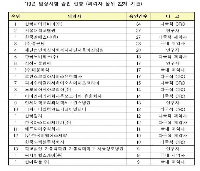 ¿¬±¸°³¹ß ¼öŹÀü¹®±â¾÷(CRO)Àº Çѱ¹¾ÆÀÌÅ¥ºñ¾Æ(34°Ç), ÄڹݽºÄÚ¸®¾Æ¼ºñ½ºÀ¯ÇÑȸ»ç(17°Ç), ÆÄ¸Ó¼öƼÄø®¼Ä¡¾î¼Ò½Ã¿¡ÀÌÃ÷ÄÚ¸®¾Æ(15°Ç) ¼øÀ̾ú´Ù. ÀÌÁß Çѱ¹¾ÆÀÌÅ¥ºñ¾Æ´Â À۳⠰¡Àå ¸¹Àº ÀÓ»ó°Ç¼ö¸¦ ±â·ÏÇÑ ±â°üÀ¸·Î À̸§À» ¿Ã·È´Ù.