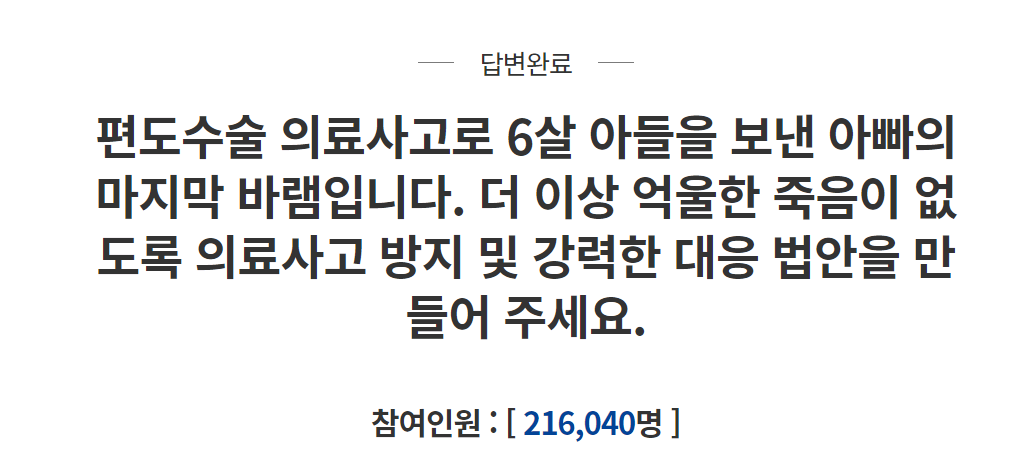 ÀÇ·á»ç°í·Î 6¼¼ ¾ÆµéÀ» ÀÒ¾ú´Ù°í ÁÖÀåÇÑ Ã»¿øÀÎÀº ¶Ç ´Ù¸¥ ¾ï¿ïÇÑ ÀÏÀ» ´çÇÏ´Â »ç¶÷ÀÌ ¾øµµ·Ï ¼ö¼ú½Ç CCTV ¼³Ä¡ Àǹ«È¿Í ÇÔ²² ÀÇ·á»ç°í ¼Ò¼Û ÁßÀÎ ÀÇ·áÀÎÀÇ ÀÇ·á¾÷ Á¾»ç ±ÝÁö¿¡ ´ëÇÑ ½Å¼ÓÇÑ ÀÇ·á¹ý °³Á¤ Çʿ伺À» ÁÖÀåÇß´Ù.