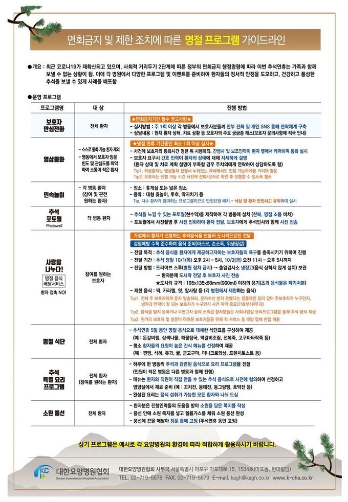 [µ¥Àϸ®¸Þµð ¹Ú´ëÁø ±âÀÚ] ´ëÇÑ¿ä¾çº´¿øÇùȸ(ȸÀå ¼Õ´öÇö)´Â Äڷγª19·Î Ãß¼® ¿¬ÈÞ ±â°£ °¡Á· ¸éȸ°¡ ±ÝÁöµÊ¿¡ µû¶ó ÀÔ¿øÈ¯ÀÚµéÀ» À§ÇØ ´Ù¾çÇÑ ÇÁ·Î±×·¥ ½Ã¾ÈÀ» ¸¶·ÃÇØ ¹èÆ÷Çß´Ù.