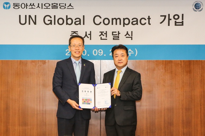 [µ¥Àϸ®¸Þµð ¾çº¸Çý ±âÀÚ] µ¿¾Æ½î½Ã¿ÀȦµù½º(´ëÇ¥ÀÌ»ç ÇÑÁ¾Çö)´Â 23ÀÏ ¼¿ï ¿ëµÎµ¿ º»»ç¿¡¼ À¯¿£±Û·Î¹úÄÞÆÑÆ®(UN Global Compact, UNGC) °¡ÀÔÁõ¼ Àü´Þ½ÄÀ» °³ÃÖÇß´Ù°í ¹àÇû´Ù.