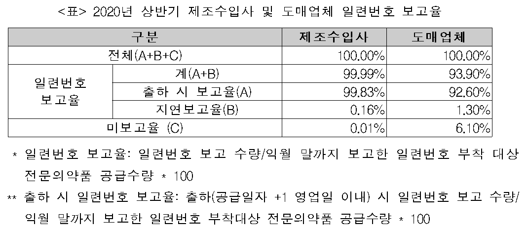 ½ÉÆò¿øÀº 23ÀÏ 2020³â »ó¹Ý±â ‘ÀǾàǰ ÃâÇÏ ½Ã ÀϷùøÈ£ º¸°í ÇöȲ’À» ºÐ¼®ÇÑ °á°ú ÃâÇÏ ½Ã ÀϷùøÈ£ º¸°íÀ²ÀÌ Á¦Á¶‧¼öÀÔ»ç´Â 99.83%, µµ¸Å¾÷ü´Â 92.60%·Î ³ªÅ¸³µ´Ù°í ¹àÇû´Ù.