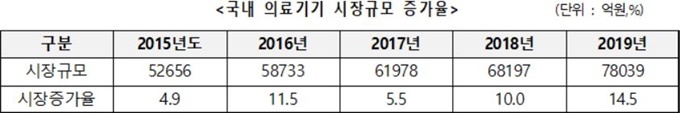 Çѱ¹ÀÇ·á±â±â»ê¾÷Çùȸ¿¡ µû¸£¸é ÀÇ·á±â±â ½ÃÀå±Ô¸ð´Â Áö³ÇØ ±âÁØ 7Á¶8000¾ï¿ø¿¡ »óȸÇϰí, ÃÖ±Ù 2³â°£ ¿¬ 10% ÀÌ»ó¾¿ ±Þ¼ºÀåÇϰí ÀÖ´Ù.