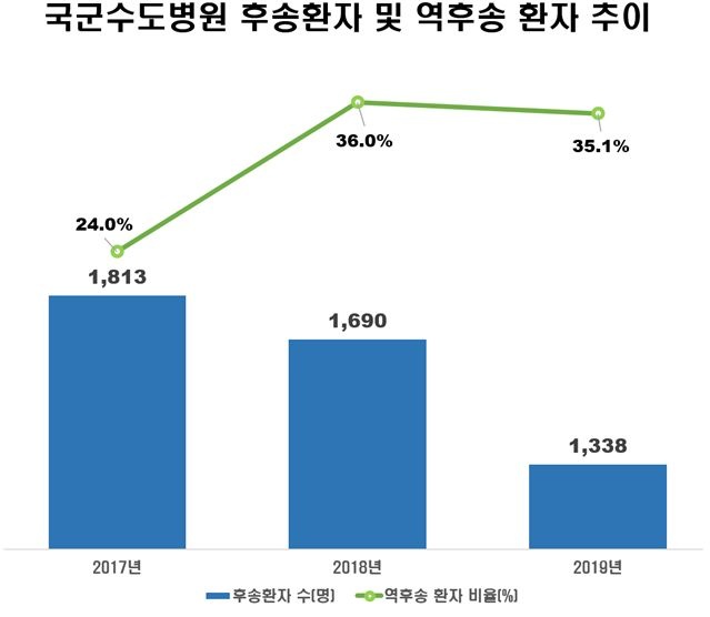 ±¹±º¼öµµº´¿ø ÈÄ¼Û È¯ÀÚ ¼ö´Â 2017³â 1831¸í¿¡¼ 2019³â 1338¸íÀ¸·Î 500¸í°¡·® °¨¼ÒÇß´Ù. ¹Ý¸é, ¿ªÈÄ¼Û ºñÀ²Àº °°Àº ±â°£ 24%¿¡¼ 35%·Î 11% ´Ã¾î³µ´Ù.
