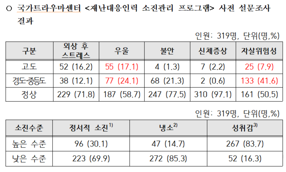 ÀÚ·á ºÐ¼® °á°ú ‘¼ÒÁø°ü¸® ÇÁ·Î±×·¥’ »çÀü ¼³¹®Á¶»ç¿¡ ÀÀÇÑ ÀÇ·áÁø 319¸í Áß 49.5%(158¸í)°¡ ÀÚ»ì À§Ç輺À» º¸¿´À¸¸ç, ¿ì¿ïÁõ»óÀ» °ÞÀº ºñÀ²µµ 41.2%(132¸í)¿¡ ´ÞÇß´Ù.