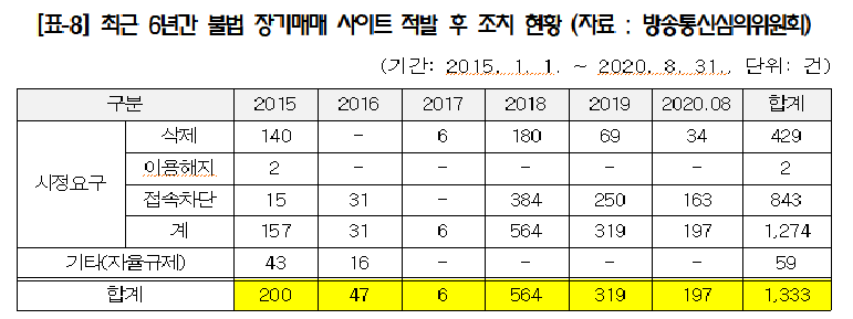 ¹æ¼ÛÅë½Å½ÉÀÇÀ§¿øÈ¸°¡ ±¹È¸ ÃÖÇý¿µ ÀÇ¿ø½Ç¿¡ Á¦ÃâÇÑ ÀÚ·á¿¡ µû¸£¸é, ÃÖ±Ù 6³â°£ ºÒ¹ý Àå±â¸Å¸Å »çÀÌÆ® Àû¹ß °Ç¼ö´Â ÃÑ 1333°ÇÀ¸·Î ³ªÅ¸³µÀ¸¸ç 2018³âµµÀÇ °æ¿ì ÇÑ ÇØ¿¡¸¸ 564°ÇÀÌ Àû¹ßµÆ´Ù.