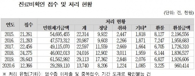 ±¹È¸ º¸°Çº¹ÁöÀ§¿øÈ¸ ³²Àμø ÀÇ¿ø(´õºÒ¾î¹ÎÁÖ´ç)ÀÌ ½ÉÆò¿øÀ¸·ÎºÎÅÍ ¹ÞÀº ‘Áø·áºñÈ®ÀÎ Á¢¼ö ¹× ó¸® ÇöȲ’¿¡ µû¸£¸é Áø·áºñÈ®Áø Á¢¼ö°Ç¼ö´Â 2015³â 2¸¸1261°Ç¿¡¼ 2017³â 2¸¸2456°Ç, 2019³â 2¸¸8643°ÇÀ¸·Î ´Ã¾î³µ´Ù. ¿ÃÇØ 6¿ù±îÁö´Â 1¸¸ 2366°ÇÀÌ Á¢¼öµÆ´Ù.