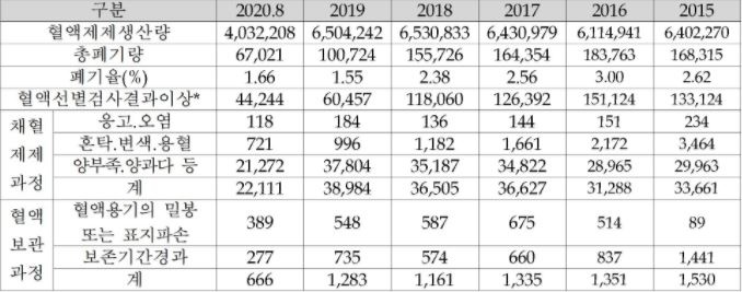 ¼¼ºÎÀûÀ¸·Î´Â äÇ÷ °úÁ¤¿¡¼ Ç÷¾×·® ºÎÁ··°ú´Ù µî 2¸¸1272°Ç, ȥŹ·º¯»ö·¿ëÇ÷ µî 721°Ç, Ç÷¾×¿ë±âÀÇ ¹ÐºÀ ¶Ç´Â Ç¥ÁöÆÄ¼Õ 389°Ç, º¸Á¸±â°£ °æ°ú 277°Ç, ÀÀ°í·¿À¿° 118°Ç µîÀ̾ú´Ù.
