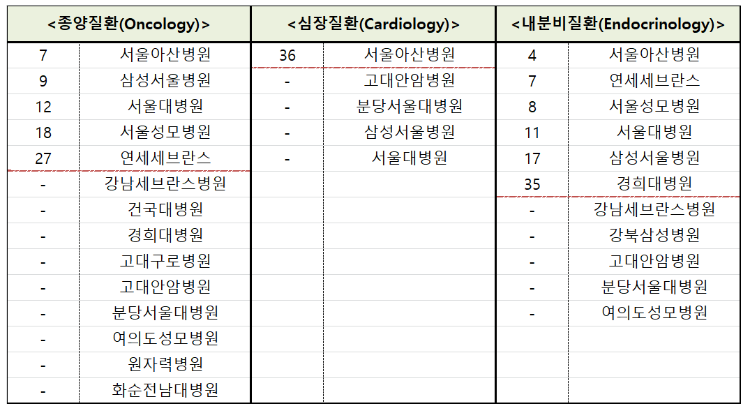 ¼¿ï¾Æ»êº´¿øÀº ¡ãÁ¾¾çÁúȯ 7À§ ¡ã½ÉÀåÁúȯ 36À§ ¡ã³»ºÐºñÁúȯ 4À§¸¦ ±â·Ï, ±¹³» º´¿ø Áß À¯ÀÏÇÏ°Ô 3°³ºÐ¾ß ¸ðµÎ¿¡¼ 50À§ ¾È¿¡ ÁøÀÔÇÏ´Â ¸í¼ºÀ» ¾ò¾ú´Ù.