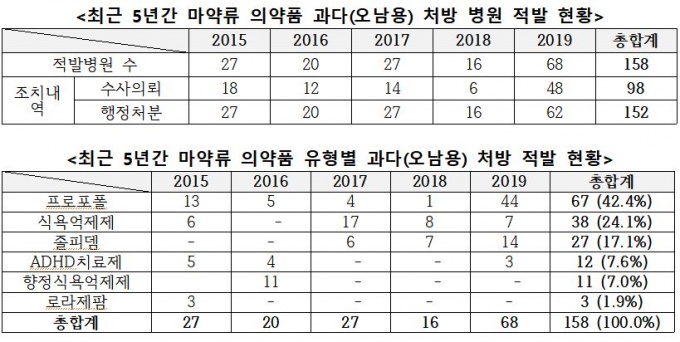±¹È¸ º¸°Çº¹ÁöÀ§¿øÈ¸ ±è¿øÀÌ ÀÇ¿ø(´õºÒ¾î¹ÎÁÖ´ç)ÀÌ ½ÄǰÀǾàǰ¾ÈÀüó·ÎºÎÅÍ ¹ÞÀº ‘ÃÖ±Ù 5³â°£ ¸¶¾à·ù ÀǾàǰÀÇ °ú´Ù(¿À³²¿ë) ó¹æ º´¿ø ÇöȲ’ ÀÚ·á¿¡ µû¸£¸é 2015³âºÎÅÍ 2019³â±îÁö ÃÑ 158°³ º´¿øÀÌ ÇÁ·ÎÆ÷Æú, ½Ä¿å¾ïÁ¦Á¦, Á¹Çǵ© µî ¸¶¾à·ù ÀǾàǰÀ» °ú´Ùó¹æÇØ º¸°Ç´ç±¹¿¡ Àû¹ßµÆ´Ù.