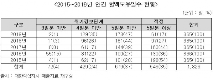 ´ëÇÑÀû½ÊÀÚ»ç´Â ¸ÅÀÏ Àü±¹ Æò±Õ 5ÀϺРȮº¸ ¿©ºÎ¸¦ ±âÁØÀ¸·Î ÀûÁ¤Ç÷¾×º¸À¯ ¿©ºÎ¸¦ ÆÇ´ÜÇϰí ÀÖ´Ù. 5ÀÏ ¹Ì¸¸À¸·Î Ç÷¾×º¸À¯·®ÀÌ ¶³¾îÁú °æ¿ì Ç÷¾×¼ö±ÞÀ§±â´Ü°è¿¡ µû¶ó ´ëÀÀÇϰí ÀÖ´Ù.