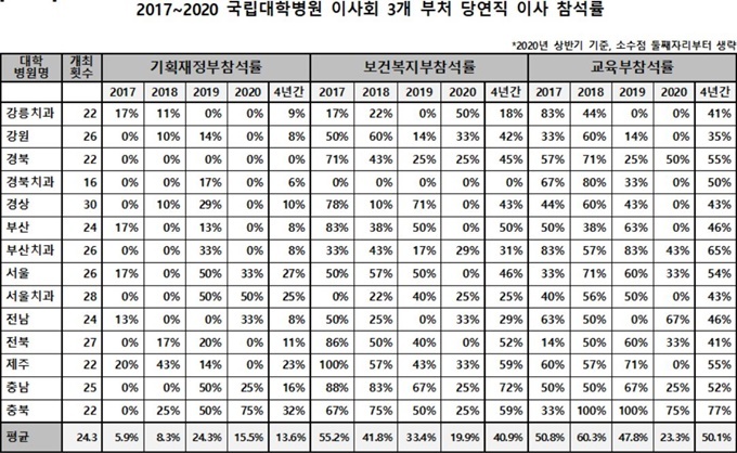±¹È¸ ±³À°À§¿øÈ¸ À±¿µ´ö ÀÇ¿ø(´õºÒ¾î¹ÎÁÖ´ç)ÀÌ °ø°³ÇÑ ‘Àü±¹ ±¹¸³´ëº´¿ø ÀÌ»çȸ Âü¼® ÇöȲ’¿¡ µû¸£¸é Áö³ 2017³âºÎÅÍ ¿ÃÇØ »ó¹Ý±â±îÁö ±³À°ºÎ·±âÀçºÎ·º¹ÁöºÎ ¼Ò¼Ó ÀÌ»çµéÀÇ È¸ÀÇ Âü¼®·üÀº °¢°¢ 50.1%, 40.9%, 13.6% µîÀ¸·Î ÀúÁ¶Çß´Ù.