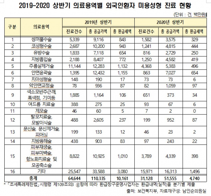 ±¹È¸ º¸°Çº¹ÁöÀ§¿øÈ¸ ³²Àμø ÀÇ¿ø(´õºÒ¾î¹ÎÁÖ´ç)ÀÌ º¸°Çº¹ÁöºÎ¿¡¼ ±¹Á¤°¨»ç ÀÚ·á·Î Á¦Ãâ¹ÞÀº ‘¿Ü±¹ÀÎȯÀÚ ¹Ì¿ë¼ºÇü ÀÇ·á¿ë¿ª¿¡ ´ëÇÑ ºÎ°¡¼¼ ȯ±Þ ÇöȲ’¿¡ µû¸£¸é, 2019³â »ó¹Ý±â´Â 6¸¸ 2625°ÇÀ̾úÀ¸³ª, 2020³â »ó¹Ý±â´Â 3¸¸ 1128°ÇÀ¸·Î °°Àº ±â°£ ȯ±Þ°Ç¼ö´Â ¹ÝÅ丷ÀÌ ³µ´Ù.