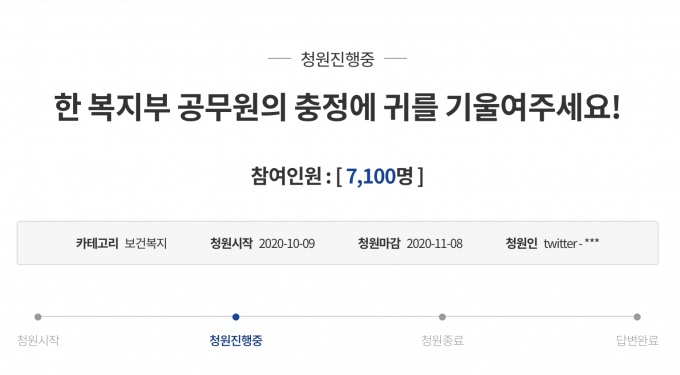 Áö³ 10¿ù 9ÀÏ Á¢¼öµÈ ‘ÇÑ º¹ÁöºÎ °ø¹«¿øÀÇ ÃæÁ¤¿¡ ±Í¸¦ ±â¿ï¿©ÁÖ¼¼¿ä’¶ó´Â Á¦¸ñÀº û¿ø ±ÛÀº 15ÀÏ ¿ÀÈÄ 8½Ã ±âÁØÀ¸·Î ¾à 7100¸íÀÇ ¼¸íÀ» ¹Þ¾Ò´Ù.