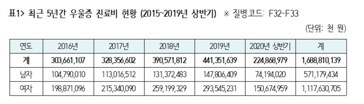 ±¹È¸ º¸°Çº¹ÁöÀ§¿øÈ¸ ±è¿øÀÌ ÀÇ¿ø(´õºÒ¾î¹ÎÁÖ´ç)ÀÌ ±¹¹Î°Ç°º¸Çè°ø´ÜÀ¸·ÎºÎÅÍ ¹ÞÀº‘ ÃÖ±Ù 5³â°£ ¿ì¿ïÁõ Áø·áºñ ÇöȲ’¿¡ µû¸£¸é 2019³â ¿ì¿ïÁõ Áø·áºñ´Â 2016³â¿¡ ºñÇØ 45.3% Áõ°¡ÇÑ 4413¾ï ¿ø¿¡ ´ÞÇß´Ù.