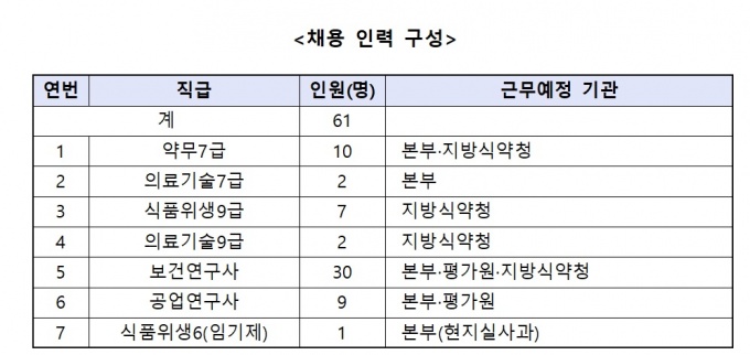 [µ¥Àϸ®¸Þµð ¾çº¸Çý ±âÀÚ] ½ÄǰÀǾàǰ¾ÈÀüó(óÀå ÀÌÀǰæ)´Â ½Äǰ·ÀǾàǰ·ÀÇ·á±â±â ¾ÈÀü°ü¸® ¾÷¹«¸¦ ¼öÇàÇÒ ±¹°¡°ø¹«¿ø ±â¼úÁ÷ ¹× ¿¬±¸Á÷ µî 61¸íÀ» ¼±¹ßÇϱâ À§ÇÑ °æ·Â°æÀïä¿ë½ÃÇèÀ» °ø°íÇÑ´Ù°í 19ÀÏ ¹àÇû´Ù.