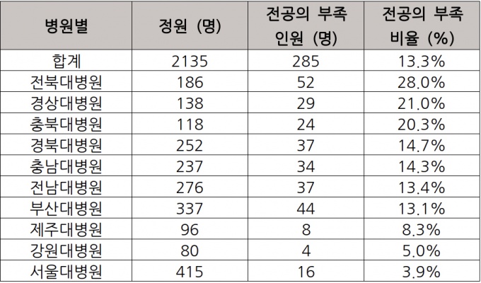 Àü°øÀÇ Á¤¿ø°ú ´ëºñÇØ ºÎÁ·ÇÑ ºñÀ²À» ºÃÀ» ¶§ Àü±¹ 10°³ ±¹¸³´ëº´¿øÀÇ Æò±ÕÀûÀÎ Àü°øÀÇ ºÎÁ· ºñÀ²Àº 13.3%¿´´Ù. Àü³²´ëº´¿ø(28.0%)¿¡ ÀÌ¾î °æ»ó´ëº´¿øÀÌ 29¸íÀÌ ºÎÁ·ÇØ Á¤¿ø ´ëºñ 21% ºÎÁ·Çß°í, ÃæºÏ´ëº´¿øÀÌ 24¸í(20.3%) ÀûÀº °ÍÀ¸·Î ³ªÅ¸³µ´Ù.
