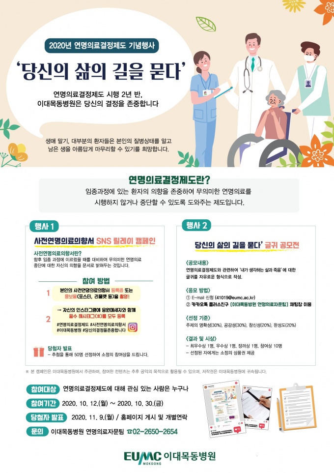 ¶Ç ‘´ç½ÅÀÇ »îÀÇ ±æÀ» ¹¯´Ù’ ±Û±Í °ø¸ðÀüÀº ‘³»°¡ »ý°¢ÇÏ´Â »î°ú Á×À½’¿¡ ´ëÇÑ ±Û±Í¸¦ ÀÚÀ¯·Î¿î Çü½ÄÀ¸·Î ÀÛ¼ºÇØ À̸ÞÀÏ(41019@eumc.ac.kr)À̳ª īī¿ÀÅå Ç÷¯½ºÄ£±¸ ‘ÀÌ´ë¸ñµ¿º´¿ø ¿¬¸íÀÇ·áÀÚ¹®ÆÀ’ äÆÃâ¿¡ º¸³»¸é µÈ´Ù.