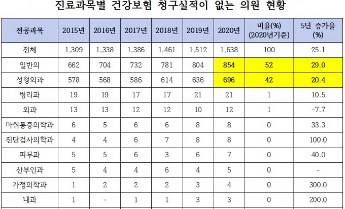 °Ç°º¸Çè û±¸ ½ÇÀûÀÌ ¾ø´Â ÀÇ¿ø ÇöȲÀ» 2015³âºÎÅÍ 2020³â ÀÚ·á±îÁö ºÐ¼®ÇÑ °ÍÀ¸·Î ÀÌ Áß¿¡ ´çÇØ ³âµµ °³¾÷À̳ª ÈÞ¾÷ÇÑ ÀÇ¿øÀº Á¦¿ÜµÆ´Ù.