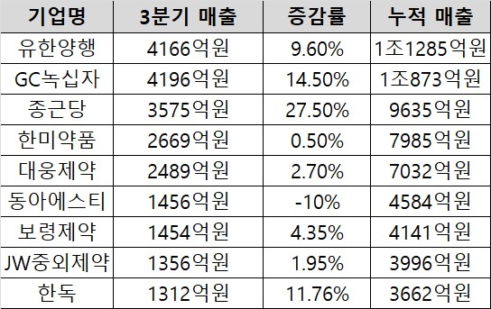 5ÀÏ ±¹³» »óÀ§ Á¦¾à»çµéÀÇ 3ºÐ±â ÀáÁ¤¿µ¾÷½ÇÀû °ø½Ã¿¡ µû¸£¸é À¯ÇѾçÇà, GC³ì½ÊÀÚ, Á¾±Ù´ç, ´ë¿õÁ¦¾à, º¸·ÉÁ¦¾à, Çѵ¶ µîÀÌ Àü³â µ¿±â ´ëºñ È£Á¶¼¼¸¦ º¸¿´´Ù. ¹Ý¸é, Çѹ̾àǰ°ú µ¿¾Æ¿¡½ºÆ¼, JWÁß¿ÜÁ¦¾àÀº ´Ù¼Ò ÁÖÃãÇÑ »óȲÀ» º¸¿´´Ù.
