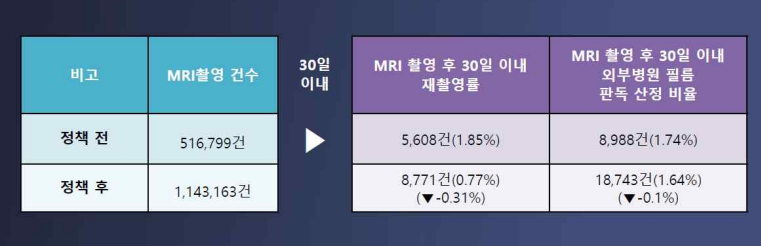 ½ÇÁ¦·Î ÇÑ ´Þ À̳» ÀçÃÔ¿µ·üÀº ÀçÃÔ¿µ ¹æÁö ±âÁØ ½Å¼³ Àü 5608°Ç(1.85%)¿¡¼ 8771°Ç(0.77%)·Î 0.31% °¨¼ÒÇß´Ù. ¶Ç, 3Â÷ ÀÇ·á±â°ü¿¡¼ Ÿ 3Â÷ ÀÇ·á±â°üÀ¸·Î ȯÀÚ°¡ À̵¿Çؼ ÀçÃÔ¿µÇÏ´Â ºñÀ²ÀÌ Á¤Ã¥ ½ÃÇà Àü¿¡´Â 0.75%, ½ÃÇà ÈÄ¿¡´Â 0.47%·Î ¼ÒÆø °¨¼ÒÇß´Ù. ¿ÜºÎ MRI ÆÇµ¶·á ¹ß»ý ºñÀ²µµ 0.41% ÁÙ¾ú´Ù.