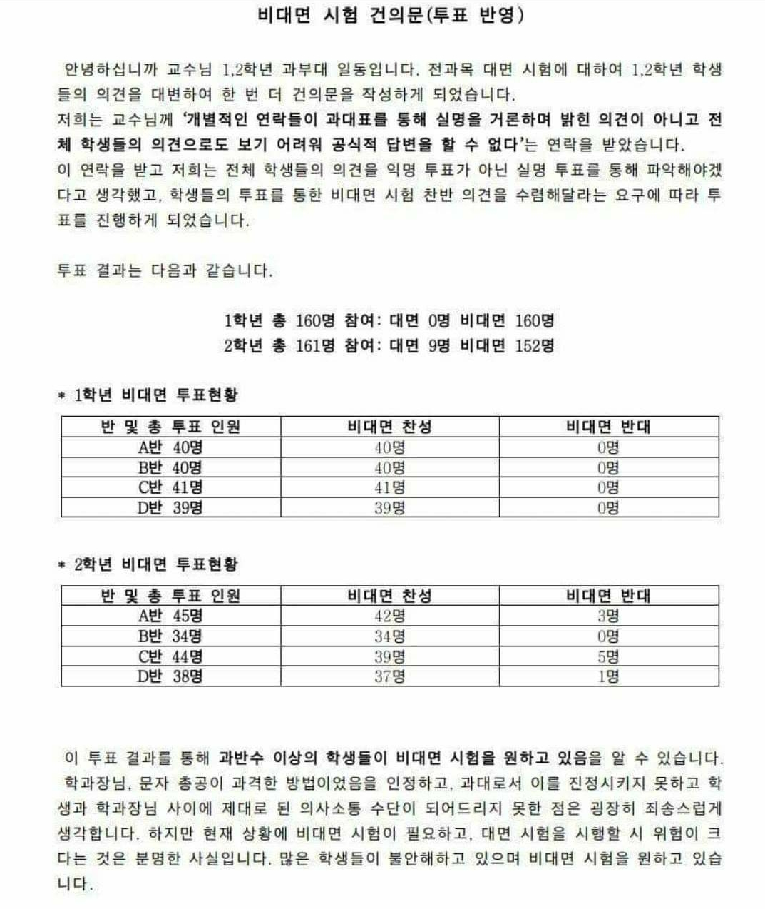 B¾¾´Â “ºñ´ë¸é ½ÃÇèÀ» À§ÇØ °ÇÀǹ®À» ÀÛ¼ºÇÏ´Â µî ÀÇÁö¸¦ º¸¿´Áö¸¸ Çб³ ÃøÀº ½Ç¸íÀ» °Å·ÐÇÏ¸ç ¹àÈù ÀǰßÀÌ ¾Æ´Ï°í Àüü Çлýµé ÀǰßÀ¸·Îµµ º¸±â ¾î·Æ´Ù°í ´äÇØ ÅõÇ¥¸¦ ÁøÇàÇß´Ù”¸ç “ÅõÇ¥ °á°ú¸¦ ÅëÇØ °ú¹Ý¼öÀÇ ÇлýµéÀÌ ºñ´ë¸é ½ÃÇèÀ» ¿øÇϰí ÀÖÀ½À» ¾Ë ¼ö ÀÖ¾ú´Ù”°í ¼³¸íÇß´Ù.