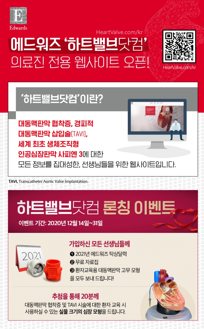 [µ¥Àϸ®¸Þµð ÇÑÇØÁø ±âÀÚ] ¿¡µå¿öÁî¶óÀÌÇÁ»çÀ̾ð½Ã½ºÄÚ¸®¾Æ(´ëÇ¥ Á¤È£¿±)´Â ¿À´Ã(14ÀÏ)ºÎÅÍ ±¹³» º¸°ÇÀÇ·á Àü¹®°¡¸¦ ´ë»óÀ¸·Î ´ëµ¿¸ÆÆÇ¸· ÇùÂøÁõ°ú °æÇÇÀû ´ëµ¿¸ÆÆÇ¸· »ðÀÔ¼ú(TAVI; Transcatheter Aortic Valve Implantation)¿¡ ´ëÇÑ ÅëÇÕÀûÀÎ Á¤º¸¸¦ Á¦°øÇÏ´Â ÀÇ·áÁø Àü¿ë À¥»çÀÌÆ® ÇÏÆ®¹ëºê´åÄÄ(https://www.heartvalves.com/kr)À» ¿î¿µÇÑ´Ù°í ¹àÇû´Ù.