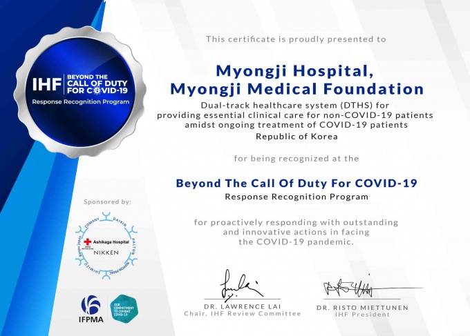 [µ¥Àϸ®¸Þµð ÀÓ¼ö¹Î ±âÀÚ] ¸íÁöº´¿ø(ÀÌ»çÀå ÀÌ¿ÕÁØ)ÀÌ ±¹Á¦º´¿ø¿¬¸Í(IHF)¿¡¼ ¼±Á¤ÇÑ ‘Äڷγª19 ´ëÀÀ ¿ì¼öº´¿ø’À¸·Î ¼±Á¤µÆ´Ù.