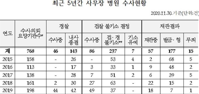 ½ÇÁ¦·Î 2015³âºÎÅÍ Áö³ÇرîÁö °Çº¸°ø´ÜÀÌ ¼ö»çÀÇ·Ú¸¦ ÇÑ »ç¹«À庴¿ø µî ±â°üÀº 768°³¼Ò¿´À¸³ª, ÇüÀÌ È®Á¤µÈ °÷Àº 177°³¼Ò(23%)¿¡ ºÒ°úÇß´Ù.