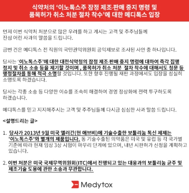 ȸ»ç´Â "½Ä¾àóÀÇ Ã³ºÐÀ¸·Î ¸¹Àº ¿ì·Á¸¦ ÇÏ°í °è½Ã´Â °í°´ ¹× ÁÖÁֵ鲲 Áø½É ¾î¸° »ç°úÀÇ ¸»¾¸À» µå¸°´Ù"¸ç "À̳ëÅ彺¿¡ ´ëÇÑ ´ëÀü½Ä¾àûÀÇ ÀáÁ¤ Á¦Á¶, ÆÇ¸Å ÁßÁö ¸í·É¿¡ ´ëÇØ Áï°¢ ÁýÇàÁ¤Áö ¹× Ãë¼Ò ¼Ò¼Û µîÀ» Á¦±âÇÒ °Í"À̶ó°í ÀÔÀåÀ» Ç¥¸íÇß´Ù.