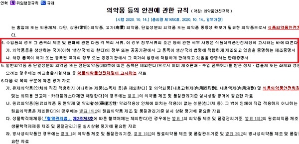 ÀǾàǰ µîÀÇ ¾ÈÀü¿¡ °üÇÑ ±ÔÄ¢ Á¦4Á¶ Á¦1Ç× Á¦4È£¸¦ º¸¸é ¼öÀÔǰÀÇ °æ¿ì »ý»ê±¹ Á¤ºÎ ¶Ç´Â °ø°ø±â°ü¿¡¼ ¹ý·É¿¡ ÀÇÇØ ÀûÇÕÇÏ°Ô Á¦Á¶µÇ°í ÀÖÀ½À» Áõ¸íÇÏ´Â Á¦Á¶Áõ¸í¼¿Í Çã°¡µî·Ï ±¹°¡ÀÇ Á¤ºÎ ¶Ç´Â °ø°ø±â°ü¿¡¼ ÀûÇÕÇÏ°Ô ÆÇ¸ÅµÇ°í ÀÖÀ½À» Áõ¸íÇÏ´Â ÆÇ¸ÅÁõ¸í¼¸¦ Á¦ÃâÇØ¾ß ÇÑ´Ù.