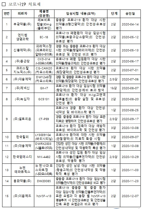 °üÀý¿° Ä¡·áÁ¦ ¼ººÐÀÎ '¹Ù¸®½ÃƼ´Õ' µî ±âÁ¸ ÀǾàǰ¿¡ ´ëÇØ Äڷγª19 Ä¡·á È¿´ÉÀ» Ãß°¡Çϱâ À§ÇÑ ÀÓ»óµµ ÁøÇàµÈ´Ù. ±¹³»¿¡¼´Â »õ·Î¿î Äڷγª19 Ä¡·áÁ¦·Î °³¹ß ÁßÀÎ Ç×üġ·áÁ¦ µî ÃÑ 15°³ Á¦Ç°(13°³ ¼ººÐ)ÀÌ ÀÓ»ó ÁßÀÌ´Ù.