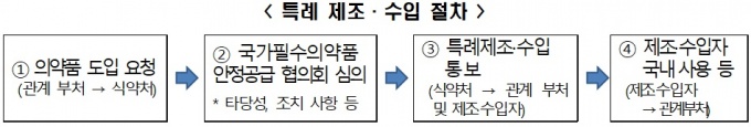 Áúº´°ü¸®Ã» µî °ü°èºÎóÀÇ ÀåÀº °¨¿°º´ µî¿¡ ´ëóÇϱâ À§ÇØ ½Ä¾àóÀå¿¡°Ô Ư·Ê Á¦Á¶³ª ¼öÀÔÀ» ¿äûÇÒ ¼ö ÀÖ´Ù. À̸¦ ½ÂÀιÞÀ¸¸é ±¹³»¿¡ ǰ¸ñÇã°¡¸¦ ¹ÞÁö ¾ÊÀº ÀǾàǰÀ» Á¦Á¶Çϰųª ¼öÀÔÇÒ ¼ö ÀÖ´Ù.