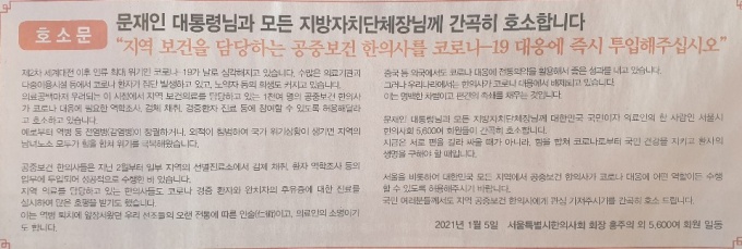 ¼¿ïƯº°½ÃÇÑÀÇ»çȸ(ÀÌÇÏ ¼¿ï½ÃÇÑÀÇ»çȸ)´Â 5ÀÏÀÚ Ù» Àϰ£Áö¿¡ ³½ ±¤°í¸¦ ÅëÇØ “¹®ÀçÀÎ ´ëÅë·É´Ô°ú ¸ðµç Áö¹æÀÚÄ¡´ÜüÀå´Ô²² °£°îÈ÷ È£¼ÒÇÑ´Ù. Áö¿ª º¸°ÇÀ» ´ã´çÇÏ´Â °øÁߺ¸°Ç ÇÑÀǻ縦 Äڷγª19 ´ëÀÀ¿¡ Áï½Ã ÅõÀÔÇØÁֽʽÿÀ”¶ó°í Ã˱¸Çß´Ù.