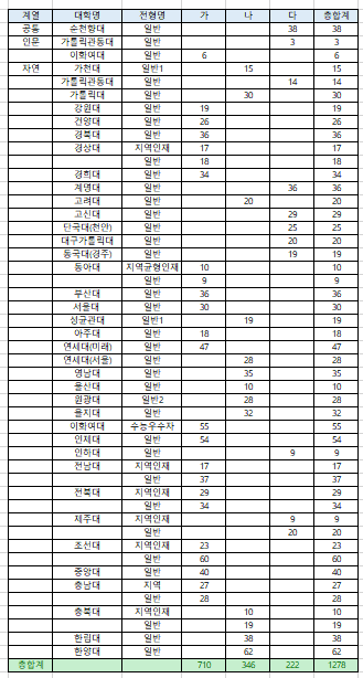 ÀüºÏ´ë, °¡Å縯´ë, °í½Å´ë, ´Ü±¹´ë(õ¾È) ´ë±¸Ä«Å縯´ë, ¼¿ï´ë, ¼º±Õ°ü´ë, ¾ÆÁÖ´ë, Àü³²´ë, Áß¾Ó´ë, ÇѸ²´ë µî¿¡¼´Â ¼öÇÐÀ» 40%¹Ý¿µÇÑ´Ù. ƯÈ÷ Ãæ³²´ë´Â 45%¸¦ ¹Ý¿µÇϰí ÀÖ¾î ¼öÇÐÀÇ ¿µÇâ·ÂÀÌ Àý´ëÀûÀÌ´Ù.