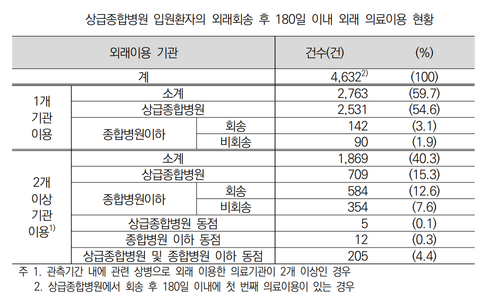 ƯÈ÷ ¿Ü·¡È¸¼ÛÀÇ °æ¿ì°¡ »ó±ÞÁ¾ÇÕº´¿øÀ» ÀÌ¿ëÇÑ ºñÀ²ÀÌ ³ô¾Ò´Ù. »ó±ÞÁ¾ÇÕº´¿ø¿¡¼ ÀÔ¿øÇÏ°í ¿Ü·¡È¸¼ÛµÈ ȯÀÚÀÇ ¾à 70%°¡ 180ÀÏ µ¿¾È »ó±ÞÁ¾ÇÕº´¿øÀ» ÁÖ·Î ÀÌ¿ëÇßÀ¸¸ç, »ó±ÞÁ¾ÇÕº´¿ø¿¡¼ ¿Ü·¡¸¦ ÀÌ¿ëÇÏ°í ¿Ü·¡È¸¼ÛµÈ ȯÀÚÀÇ 41.5%°¡ ¶Ç ´Ù½Ã »ó±ÞÁ¾ÇÕº´¿øÀ» ÀÌ¿ëÇß´Ù.
