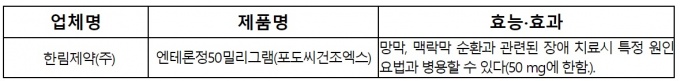 11ÀÏ ½ÄǰÀǾàǰ¾ÈÀüó´Â ÃÖ±Ù ÇѸ²Á¦¾àÀÇ ¿£Å×·ÐÁ¤50mgÀÌ º¸À¯ÇÑ '¸Á¸·, ¸Æ¶ô¸· ¼øÈ¯°ú °ü·ÃµÈ Àå¾Ö Ä¡·á½Ã ƯÁ¤ ¿øÀοä¹ý°ú º´¿ëÇÒ ¼ö ÀÖ´Ù'´Â È¿´É·È¿°ú¸¦ ÀçÆò°¡ÇÑ´Ù°í ¹àÇû´Ù.