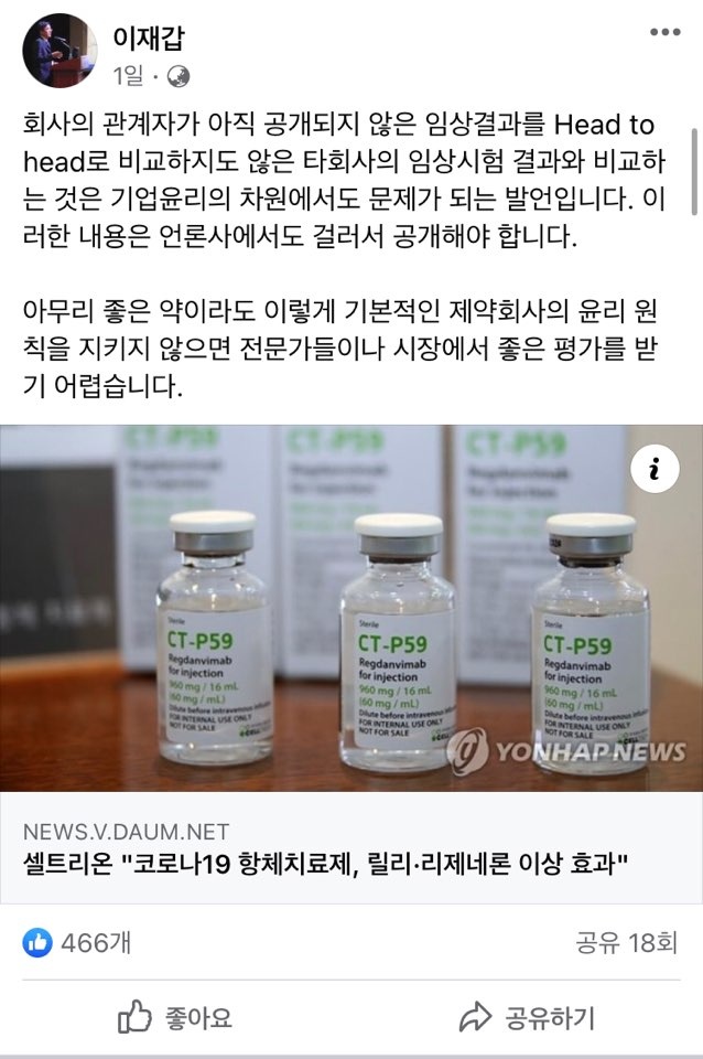 ÀÌÀç°© ±³¼ö´Â Áö³ 12ÀÏ ÆäÀ̽ººÏÀ» ÅëÇØ "ȸ»ç(¼¿Æ®¸®¿Â) °ü°èÀÚ°¡ ÀÓ»ó °á°ú¸¦ Á÷Á¢ºñ±³ÀÓ»ó(Head to head)À¸·Î ÁøÇàÇÏÁö ¾ÊÀº ´Ù¸¥ ȸ»ç Ä¡·áÁ¦¿Í ºñ±³ÇÏ´Â °ÍÀº ±â¾÷À±¸® Â÷¿ø¿¡¼ ¹®Á¦°¡ µÈ´Ù. ¾Æ¹«¸® ÁÁÀº ¾àÀÌ¶óµµ À±¸® ¿øÄ¢À» ÁöŰÁö ¾ÊÀ¸¸é Àü¹®°¡³ª ½ÃÀå¿¡¼ ÁÁÀº Æò°¡¸¦ ¹Þ±â ¾î·Æ´Ù"°í ºñÆÇ. ÀÌ ±³¼öÀÇ ÁöÀûÀº °°Àº ³¯ ±Ç±â¼º ¼¿Æ®¸®¿Â ¿¬±¸°³¹ßº»ºÎÀåÀÌ À̱¤Àç·È²Èñ·½ÅÇö¿µ ÀÇ¿øÀÌ °øµ¿°³ÃÖÇÑ '¹Ì·¡¿ÍÀÇ ´ëÈ : Äڷγª19 Ŭ¸° ±¹°¡·Î °¡´Â ±æ' Åä·Ðȸ¿¡ Âü¼®Çؼ "·ºÅ°·Î³ªÁÖ°¡ ¸±¸®, ¸®Á¦³×·ÐÀÇ Ç×üġ·áÁ¦¿Í ºñ±³ÇØ µ¿µî ÀÌ»óÀÇ °á°ú¸¦ ¾ò¾ú´Ù"°í ¹ß¾ðÇÑ °Í¿¡ ´ëÇØ ºÎÀûÀýÇÏ´Ù´Â ÀÔÀåÀ» ÇÇ·ÂÇÑ °Í.