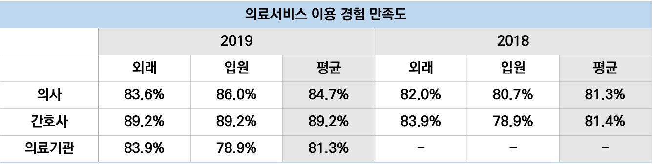 ÀÇ»ç ÀÔ¿ø¼ºñ½º ¸¸Á·µµ´Â 2019³â 86.0%·Î Àü³â(80.7%)µµ¿¡ ºñÇØ ºñ±³Àû Å« ÆøÀ¸·Î »ó½ÂÇß´Ù.
