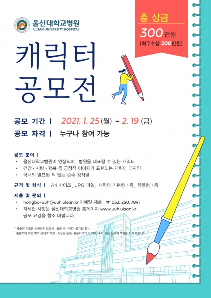 [µ¥Àϸ®¸Þµð ¹ÚÁ¤¿¬ ±âÀÚ] ¿ï»ê´ëÇб³º´¿øÀº 2¿ù 19ÀϱîÁö º´¿øÀ» ´ëÇ¥ÇÒ ‘¿ï»ê´ëº´¿ø ij¸¯ÅÍ °ø¸ðÀü’À» ½Ç½ÃÇÑ´Ù°í 25ÀÏ ¹àÇû´Ù.