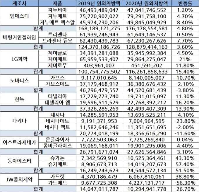 ¼Â Áß °¡Àå ¼ºÀå·üÀÌ ³·Àº ´ÜÀÏÁ¦ 'ÀÚ´©ºñ¾Æ'´Â 2019³âº¸´Ù 1.2% ¿À¸¥ 470¾ï¿øÀ̾ú´Ù. ÀÚ´©ºñ¾Æ ÆÐ¹Ð¸®´Â DPP-4 ¾ïÁ¦Á¦ °è¿ 1À§·Î ÃÑ 1761¾ï¿øÀÇ Ã³¹æ ½ÇÀûÀ» ±â·ÏÇß´Ù.