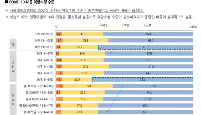 ´Ù¸¸ Äڷγª19¸¦ °è±â·Î ¼¿ï´ëº´¿øÀÇ °ø°øÀÇ·á ±â¿©µµ¿¡ ´ëÇÑ ÀνÄÀº ¼ÒÆø °³¼±µÆ´Ù. Äڷγª19°¡ ¹ß»ýÇϱâ Àü 50.9%¿´´ø ±àÁ¤Æò°¡°¡ Äڷγª19 ¹ß»ý ÀÌÈÄ¿¡´Â 58.5%·Î »ó½ÂÇß´Ù.