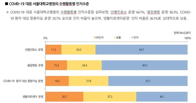 ±¹°¡Áß¾Óº´¿øÀ¸·Î¼ °áÄÚ ´Þ°¡¿î ¼ºÀûÀÌ ¾Æ´Ô¿¡µµ º´¿øÀº °ú°¨ÇÏ°Ô °ø°³Çß´Ù. ±¹¹ÎµéÀº ¼¿ï´ëº´¿øÀÇ Äڷγª19 ´ëÀÀ¿¡ ±àÁ¤ 65.3%, º¸Åë 30.5%, ºÎÁ¤ 4.2%·Î ´äÇß´Ù.