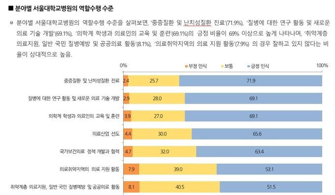 ¼¿ï´ëº´¿øÀÇ ¿ªÇÒ ¼öÇà¿¡ ±àÁ¤ÀûÀÎ ÀνÄÀº 65.3%, º¸Åë 31.4%, ºÎÁ¤ 3.2%·Î Á¶»çµÆ´Ù. ƯÈ÷ 20~40´ë, ¼Òµæ ¼öÁØÀÌ ³·Àº °èÃþ¿¡¼ Æò°¡°¡ ¹ÚÇß´Ù.
