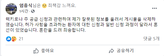 ÇÏÁö¸¸ ±×´Â À̳» °°Àº ³¯, 3½Ã°£µµ ä Áö³ªÁö ¾ÊÀº ¿ÀÈÄ 6½Ã°æ "·ºÅ°·Î³ªÁÖ °ø±Þ ½Åû°ú °ü·ÃÇØ¼ Á¦°¡ À߸øµÈ Á¤º¸¸¦ ¿Ã·Á °Ô½Ã¹°À» »èÁ¦Çß´Ù"¸ç Çã°¡ »çÇ×À» ÃʰúÇϴ ȯÀÚ¿¡ ´ëÇÑ ½Åû°ú ÀÏ¹Ý ½Åû °úÁ¤ÀÌ ´Þ¶ó È¥¼±ÀÌ ÀÖ¾ú´Ù"¸ç È¥¶õÀ» µå·Á Á˼ÛÇÏ´Ù°í »ç°úÇß´Ù.