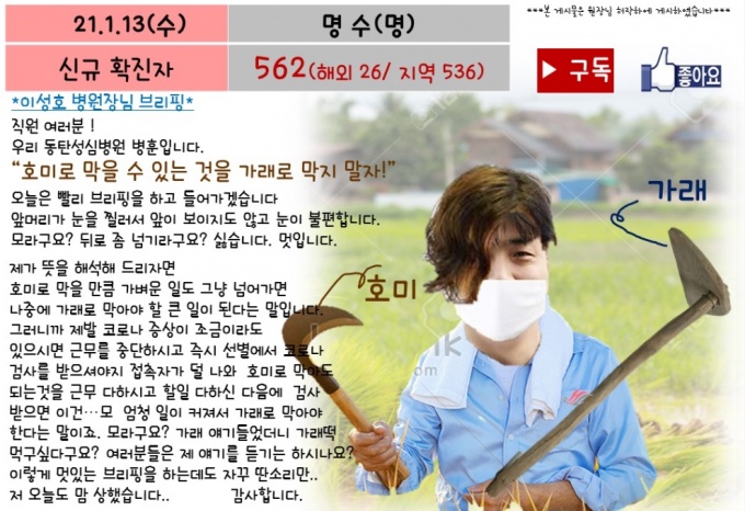 ¾÷¹« Áß½ÉÀÇ °øÁö»çÇ×ÀÌ ¿Ã¶ó¿À´ø »ç³»°Ô½ÃÆÇ¿¡ ‘º´¿øÀåÀÇ ½Å¹ÚÇÑ Äڷγª ºê¸®ÇÎ’Àº ±³Á÷¿øµé¿¡°Ô ½Å¼±ÇÑ Ãæ°ÝÀ» ÁÖ°í ÀÖ´Ù.