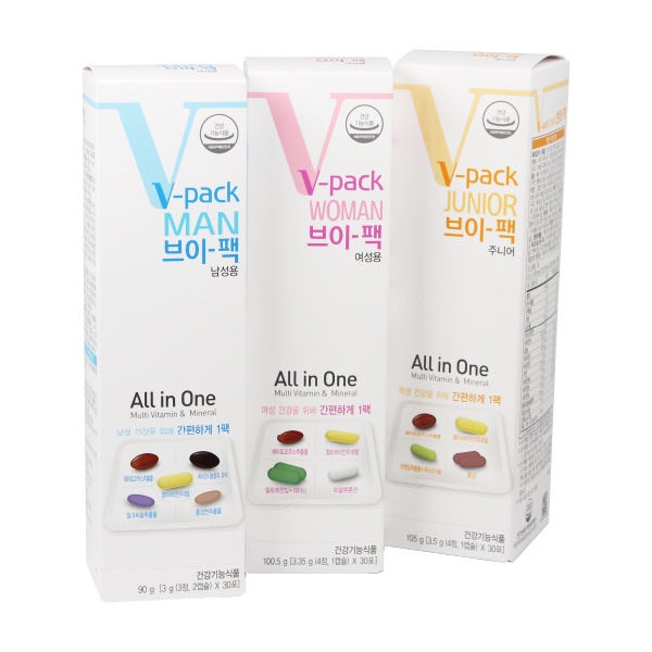 V-PACKÀº ³²¼º¿ë, ¿©¼º¿ë, ÁÖ´Ï¾î µî 3°¡Áö Á¾·ù¸¦ °®Ãß°í ÀÖ´Ù. ³²¼º¿ëÀº 3Á¤ 2ĸ½¶, ¿©¼º¿ë°ú ÁִϾî´Â 4Á¤ 1ĸ½¶·Î ±¸¼ºµÅ ÀÖÀ¸¸ç, °øÅ뼺ºÐÀ¸·Î Ç츶ÅäÄÚÄí½º(1ĸ½¶), ¸ÖƼºñŸ¹Î ¹Ì³×¶ö(1Á¤) µîÀÌ µé¾î ÀÖ´Ù.