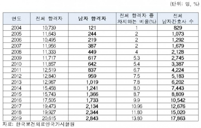 °£È£»ç ±¹½Ã ³²¼º ÇÕ°ÝÀÚ ¼öµµ ¸Å³â Å©°Ô ´Ã¾î³ª°í ÀÖ´Ù. 1996³â 19¸í¿¡¼ ¡ã2000³â 45¸í ¡ã2009³â 619¸í ¡ã2019³â¿¡´Â 2843¸íÀ¸·Î ±ÞÁõÇß´Ù. 2019³â °£È£»ç ±¹½Ã ÇÕ°ÝÀÚ 8¸í Áß 1¸íÀº ³²ÀÚ¿´´Ù.