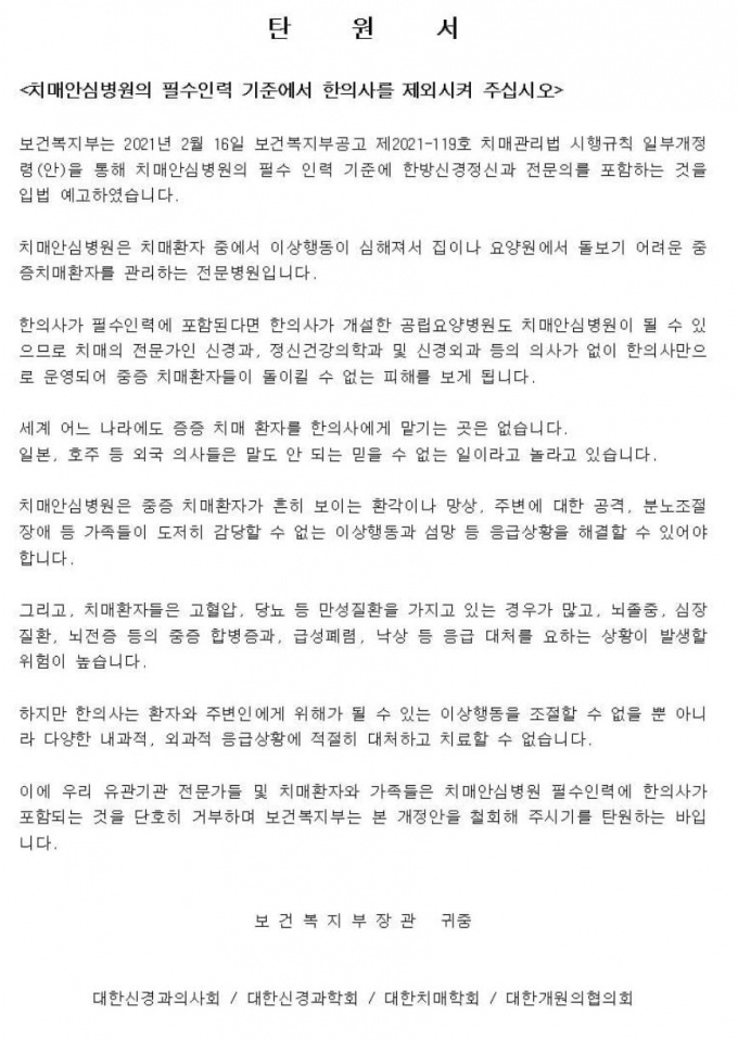 16ÀÏ ´ëÇѽŰæ°úÀÇ»çȸ, ´ëÇѽŰæ°úÇÐȸ, ´ëÇÑÄ¡¸ÅÇÐȸ µî 3°³ À¯°üÇÐȸ¿Í ´ëÇѰ³¿øÀÇÇùÀÇȸ´Â Ä¡¸Å¾È½Éº´¿ø Çʼö Àη ±âÁØ¿¡¼ ÇÑÀǻ縦 Á¦¿Ü½ÃÄÑ´Þ¶ó´Â ³»¿ëÀÇ Åº¿ø¼¸¦ º¸°Çº¹ÁöºÎ¿¡ Á¦ÃâÇß´Ù°í ¹àÇû´Ù.