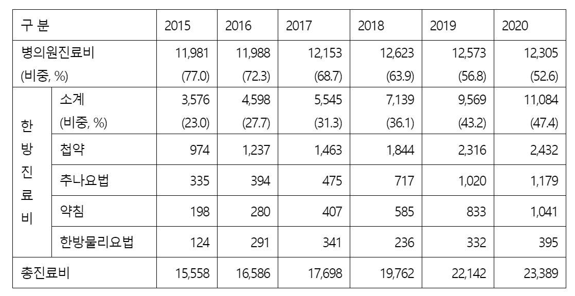 ÀÚµ¿Â÷º¸Çè Çѹæ Áø·áºñ´Â 2015³â 3õ576¾ï¿ø¿¡¼ 20%´ë Áõ°¡À²À» ±â·ÏÇϸç 5³â ¸¸¿¡ 3¹è·Î Áõ°¡ÇÑ 1Á¶1084¾ï¿øÀ» ±â·ÏÇß´Ù. ±× °á°ú, ÃÑÁø·áºñ ´ëºñ ÇѹæÁø·áºñ ºñÁßÀº 2015³â 23.0%¿¡¼ 47.4%·Î È®´ëµÆ´Ù